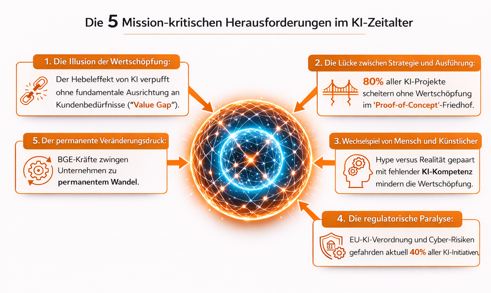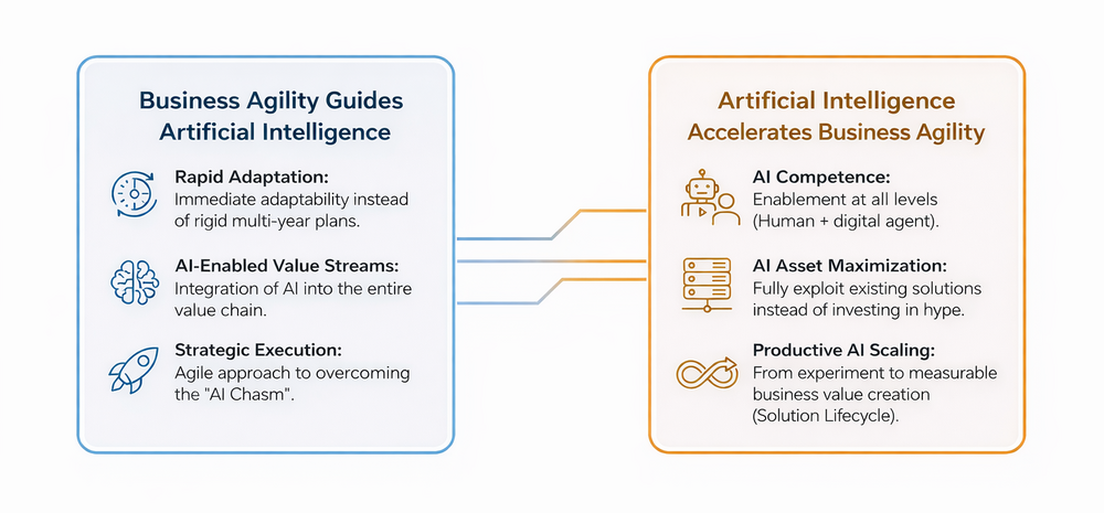 Business Agility ist die Grundvoraussetzung, um die EDGE-Kräfte (Exponentielles Wachstum, Disruption, Generative Kreativität, Emergentes Verhalten) zu meistern und die enormen KI-Fehlinvestitionen zu überwinden.
