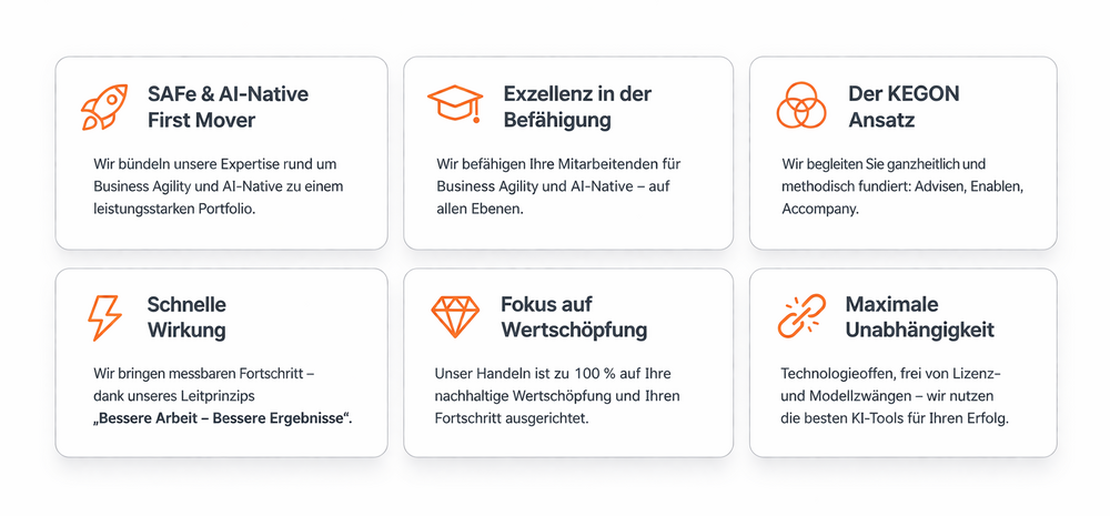 - Schnelles Adaptieren: Das KI-Zeitalter verlangt nach sofortiger Anpassungsfähigkeit von Menschen und der gesamten Organisation. Wer an starren Mehrjahresplänen festhält, verliert den Anschluss. Dies gilt von der Strategie- bis in die Teamebene.