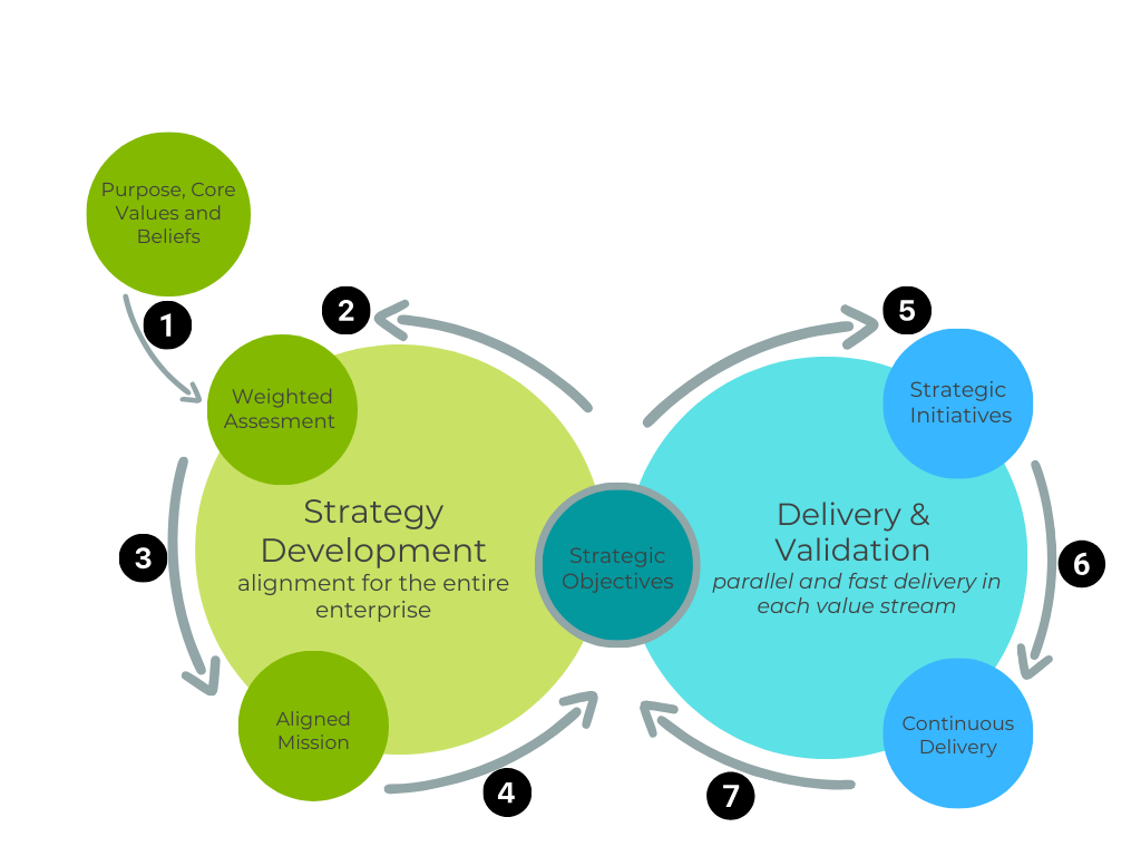 We combine modern strategy work with the Business Agility Flow to create a model that enables clarity, effectiveness, and continuous organizational learning.